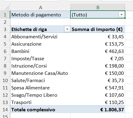 In pochi istanti avrai un report dinamico pronto all’uso, nel nostro esempio verranno raggruppate le spese familiari divise per mese.