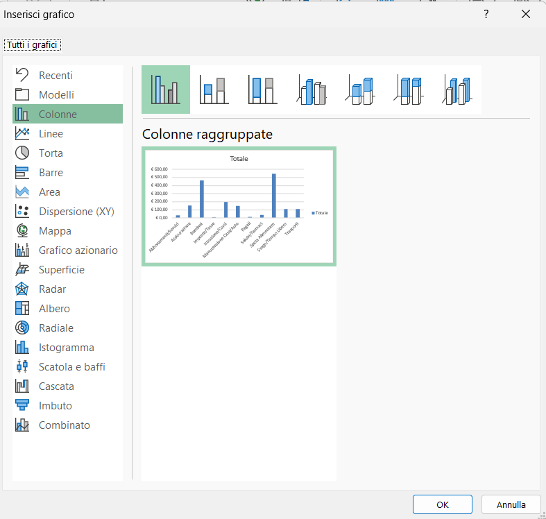 Si aprirà una popup che ci permetterà di scegliere la rappresentazione grafica che preferiamo: Colonne, Linee, Torte, Barre ecc..