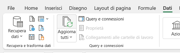 Cliccare dalla barra multifunzione “Dati” -> “Aggiorna tutti” ed i dati verranno automaticamente aggiornati.