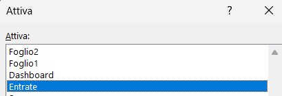 Si aprirà una finestra di dialogo “Attiva” che ci farà vedere l’elenco dei fogli presenti. Il file evidenziato in blu è il foglio aperto.
