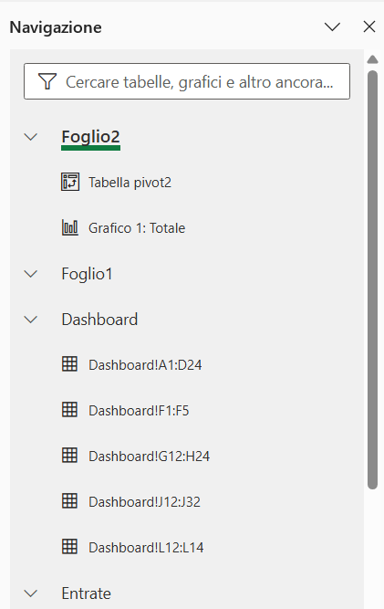 Cliccando sul testo “Foglio 4 di 8” sulla barra di navigazione si aprirà a destra il menù “Navigazione” . Che mostrerà nuovamente il nome dei fogli ed il loro contenuto: Tabelle, Grafici, Tabelle Pivot.