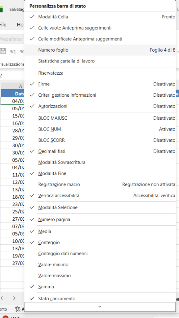 Aprire il menù della barra di stato e cliccare sul menù “Numero foglio”. Questo farà visualizzare in basso a sinistra il foglio attivo ed il numero totale di fogli presenti “Foglio 4 di 8”.