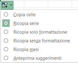 Il quadratino che si visualizza in basso a destra aprirà una casella a discesa che mostra le “Opzioni di riempimento automatico”. Dove si può decidere se copiare solo le celle, ricopiare la serie, ricopiare la formattazione della cella precedente ecc.