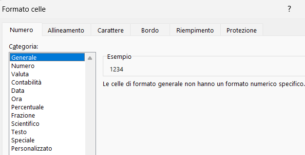 Il formato “Generale” è solitamente quello predefinito, che si presta a visualizzare più contenuti.