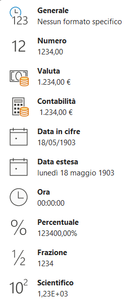 Vi è poi il formato “Percentuale” che, oltre a visualizzare il simbolo “%”, moltiplica il numero per cento, cosa questa che può creare qualche problema se non tenuta in considerazione nelle formule. Se si formatta una data ci sono un paio di formati disponibili: “Data in cifre” e “Data estesa”.