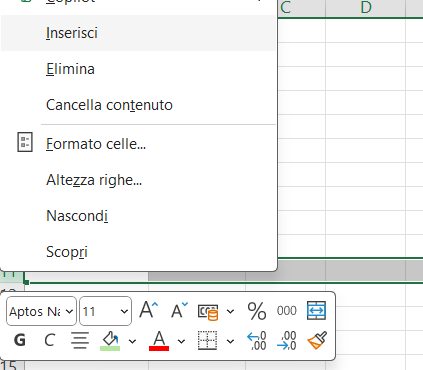 Per aggiungere nuove colonne o righe al nostro foglio di lavoro cliccare con il pulsante destro del mouse sulla riga o colonna dove si vuole inserire, dalla tendina a discesa cliccare “Inserisci” per aggiungere una colonna o riga. Cliccare “Elimina” se si vuole cancellare una colonna o riga.